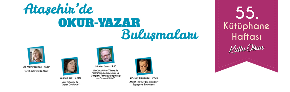 55. Kütüphane Haftası kapsamında, Ahmet Telli Çocuk ve Halk Kütüphanesi'nde okurlarla yazarların bir araya geleceği, dijital çağda kütüphanecilik üzerine düşüneceğimiz, raflar arasında keyifli bir yolculuğa çıkacağımız bir dizi etkinlik düzenliyoruz ve ortak tutkuları kitap olan yazar, şair ve akademisyenlerle söyleşi ve seminerlerde bir araya geliyoruz.