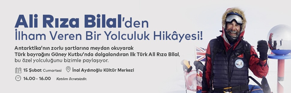 Tek başına çıktığı 1000 kilometrelik yolculuk boyunca zorlu doğa koşullarına meydan okuyarak Türk bayrağını Güney Kutbu’nda dalgalandıran ilk Türk olan Ali Rıza Bilal, Antarktika’da geçirdiği günleri, karşılaştığı zorlukları ve bu eşsiz keşfin ona kattıklarını katılımcılarla paylaşacak.