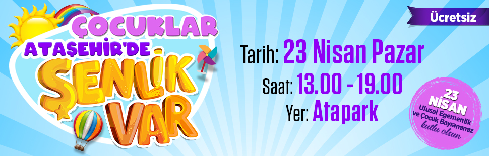 23 Nisan Ulusal Egemenlik ve Çocuk Bayramı’nın her yıl büyük neşeyle kutlandığı Ataşehir’de, bu yıl da birbirinden renkli ve eğlenceli etkinlikler çocukları bekliyor. 23 Nisan Pazar günü Atapark’ta yapılacak etkinlikler, saat 13.00’de MC Sahne ve Bubble Show gösterileriyle başlayacak. Gün boyu sürecek etkinliklerde; çocuklar için sürpriz yarışmalar, atölyeler, jonglör, vantrolog, karnaval oyunları gibi birçok gösteri düzenlenecek.