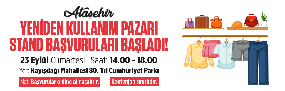 Atık azaltma, ürünün yeniden kullanımı ve maddesel geri dönüşüm stratejileri hakkında farkındalık oluşturmak amacıyla Ataşehir Belediyesi tarafından gerçekleştirilen "Ataşehir Yeniden Kullanım Pazarı"na kullanmadığınız eşyalarınızla katılarak siz de katkı sağlayabilirsiniz.