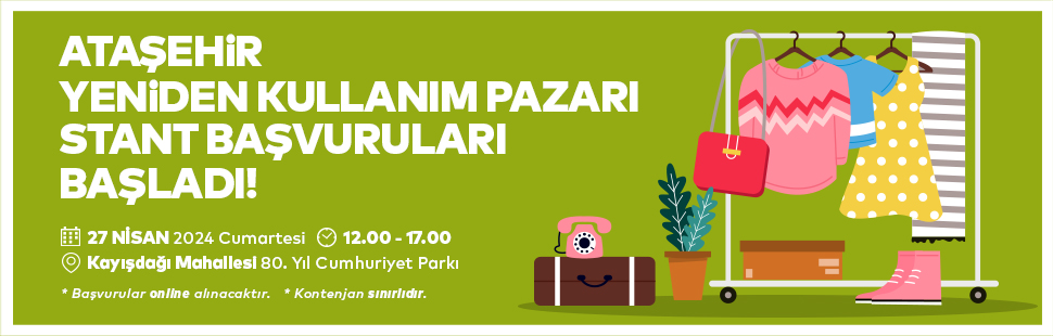 "Kiminin Eskisi Kiminin Yenisi" diyor ve sizleri Kayışdağı Mahallesi 80. Yıl Cumhuriyet Parkı'nda kurulacak olan "Ataşehir Yeniden Kullanım Pazarı"na davet ediyoruz. Atık azaltma, ürünün yeniden kullanımı ve maddesel geri dönüşüm stratejileri hakkında farkındalık yaratmak amacıyla Ataşehir Belediyesi tarafından gerçekleştirilecek "Ataşehir Yeniden Kullanım Pazarı"na kullanmadığınız eşyalarınızla katılarak siz de bu döngüye katkı sağlayabilirsiniz. Satmak veya takas etmek istediğiniz en az 20 adet 2. el eşyanızı 80. Yıl Cumhuriyet Parkı'na getirebilir, pazar alanını ziyaret edenlere satabilirsiniz.