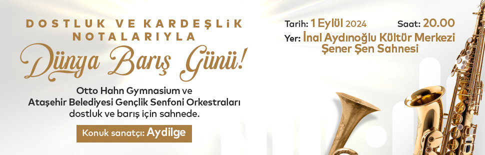 Dünya Barış Günü’ne özel Almanya’dan Otto Hahn Gymnasium Gençlik Senfoni Orkestrası İstanbul’a geliyor. Ataşehir Belediyesi Gençlik Orkestrası ile birlikte ortak konserler verecek olan Otto Hahn Gymnasium Gençlik Senfoni Orkestrası 1-2 Eylül 2024 tarihlerinde sahne alacak. Konuk sanatçı olarak Aydilge de katılım sağlayacak.