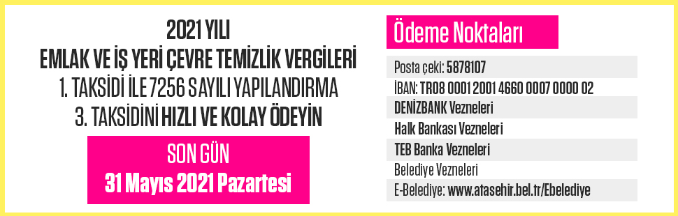 ‘‘2021 yılı Emlak ve İş Yeri Çevre Temizlik Vergileri 1. taksidi ile 7256 Sayılı Yapılandırma 3. taksit ödemesi için son günü 31 Mayıs Pazartesi.