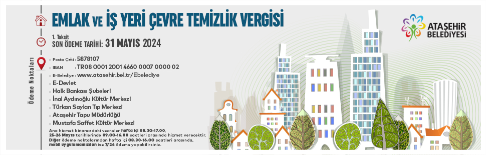 2024 yılı Emlak ve İş Yeri Çevre Temizlik Vergisi 1. Taksit ödemesi için son gün 31 Mayıs Cuma.