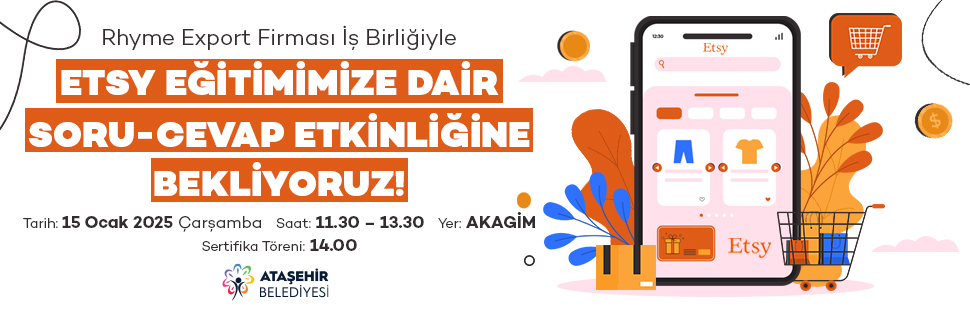 Ataşehir Belediyesi Kadın Girişimcilik Merkezi (AKAGİM) tarafından Aralık ayında düzenlenen online ETSY Eğitiminin yüz yüze soru - cevap etkinliği, 15 Ocak 2025 Çarşamba günü 11.30 - 13.30 saatleri arasında AKAGİM’de gerçekleştirecek.