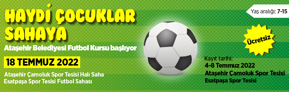 Futbolla ilgilenen ve bu alanda yeteneklerini geliştirmek isteyen 7-15 yaş arasındaki çocuk ve gençler; 18 Temmuz’da, Ataşehir Çamoluk Spor Tesisi Halı Sahası’nda ve Esatpaşa Spor Tesisi Futbol Sahası’nda ücretsiz olarak düzenlenecek Futbol eğimlerine katılabilecekler.