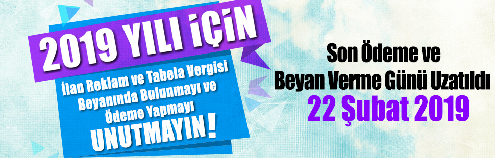 İlan Reklam ve Tabela vergileri son ödeme ve son beyan verme günü 22 Şubat 2019 Cuma gününe kadar uzatıldı.