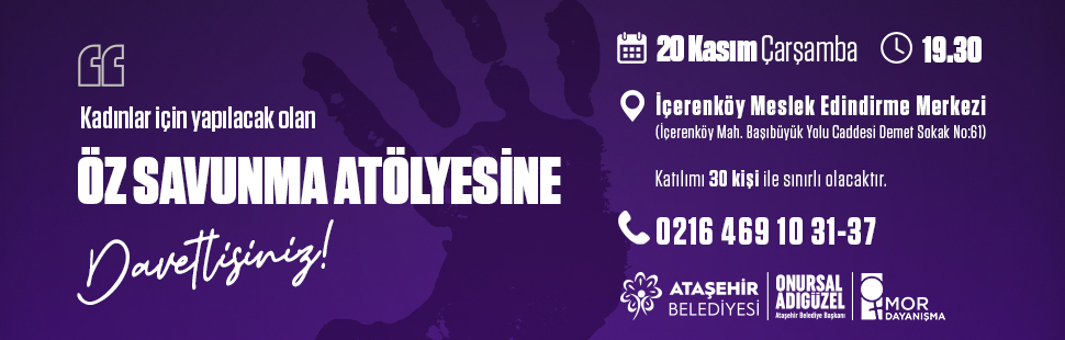 “Kadına Yönelik Şiddetle Mücadele Günü” dolayısıyla Ataşehir Belediyesi ve Mor Dayanışma Derneği iş birliğiyle “Öz Savunma Atölyesi” düzenlenecek.