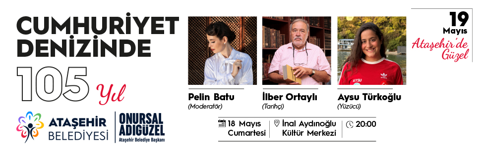 Ataşehir Belediyesi’nin, 19 Mayıs Atatürk’ü Anma, Gençlik ve Spor Bayramı dolayısıyla düzenleyeceği etkinlikte; Pelin Batu’nun moderatörlüğünde büyük Tarihçi ve Yazar Prof. Dr. İlber Ortaylı ile üç okyanusu kulaçlamış 23 yaşındaki yüzücü Aysu Türkoğlu “Cumhuriyet Denizinde 105 Yıl” isimli söyleşi programıyla Ataşehirlilerle buluşacak.