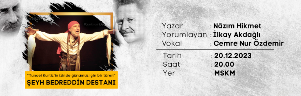 Televizyon izleyicilerinin Çukur, Kızılcık Şerbeti, Pis Yedili gibi dizilerden tanıdığı İlkay Akdağlı, türküler, semahlar, ağıtlar, klasik ve özgün ezgilerle harmanlayıp yeniden yorumlayarak, müzikal bir gösteri formunda Şeyh Bedreddin Destanı’nı yeniden izleyiciyle buluşturuyor.