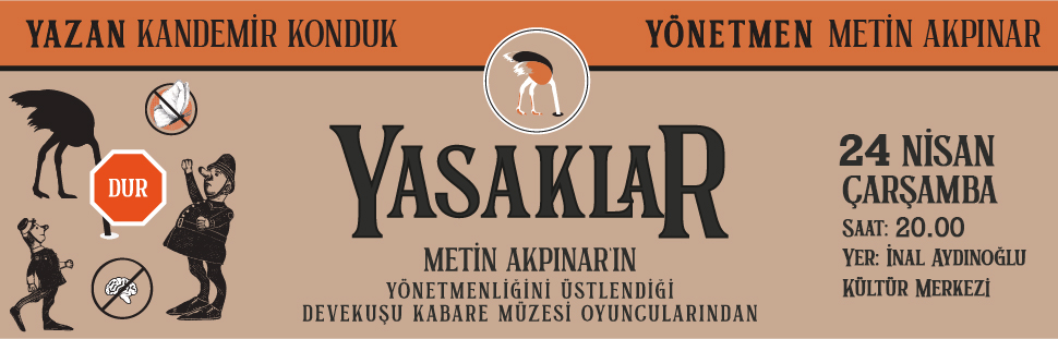 Türk Tiyatrosunun duayenlerinden Metin Akpınar, Yasaklar isimli oyunun hikayesini söyle anlatıyor: "Yıllar önce Kandemir Konduk bana geldi. Mide rahatsızlığı olduğunu, doktorların her şeyi yasak ettiğini, yaşadıklarının ona yasaklar diye bir oyun yazma düşüncesi oluşturduğunu söyledi. Ben de birkaç episod deneme yazmasını önerdim. Gelen örnekler çok güzeldi. Yasaklar oyununun yazılmasına karar verdik. Yasaklar bu minik öykü ile başladı. Ortaya Kandemir’inde Devekuşu Kabare’nin de en güzel yapıtlarından biri çıktı. Yeryüzünde düşünen tek canlı insandır. Düşüncenin en saygın en soylu biçimi sanattır. Bugüne kadar vardığımız en iyi idare şekli demokrasidir. Demokrasinin vazgeçilmezi düşünce özgürlüğüdür ve ifade özgürlüğüdür. Ne yazık ki zaman zaman hatta çoğunlukla müesses nizam , siyasi otorite bu olgulara yasaklar getirir. Yasaklar oyununda yasakların mizah diliyle şanson, dans ve episodlarla eleştirildiğini izleyeceksiniz."