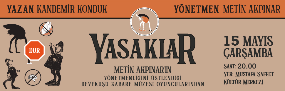 Türk Tiyatrosunun duayenlerinden Metin Akpınar, Yasaklar isimli oyunun hikayesini söyle anlatıyor: "Yıllar önce Kandemir Konduk bana geldi. Mide rahatsızlığı olduğunu, doktorların her şeyi yasak ettiğini, yaşadıklarının ona yasaklar diye bir oyun yazma düşüncesi oluşturduğunu söyledi. Ben de birkaç episod deneme yazmasını önerdim. Gelen örnekler çok güzeldi. Yasaklar oyununun yazılmasına karar verdik. Yasaklar bu minik öykü ile başladı. Ortaya Kandemir’inde Devekuşu Kabare’nin de en güzel yapıtlarından biri çıktı. Yeryüzünde düşünen tek canlı insandır. Düşüncenin en saygın en soylu biçimi sanattır. Bugüne kadar vardığımız en iyi idare şekli demokrasidir. Demokrasinin vazgeçilmezi düşünce özgürlüğüdür ve ifade özgürlüğüdür. Ne yazık ki zaman zaman hatta çoğunlukla müesses nizam, siyasi otorite bu olgulara yasaklar getirir. Yasaklar oyununda yasakların mizah diliyle şanson, dans ve episodlarla eleştirildiğini izleyeceksiniz."