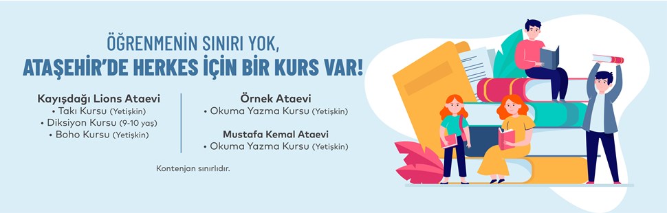 Ataşehir Belediyesi’ne bağlı Kayışdağı Lions Ataevi’nde yetişkinler için takı ve boho kursu, çocuklar için de diksiyon kursu düzenlenecek. Örnek Ataevi ile Mustafa Kemal Ataevi’nde de yetişkinler için okuma-yazma kursu düzenlenecek.