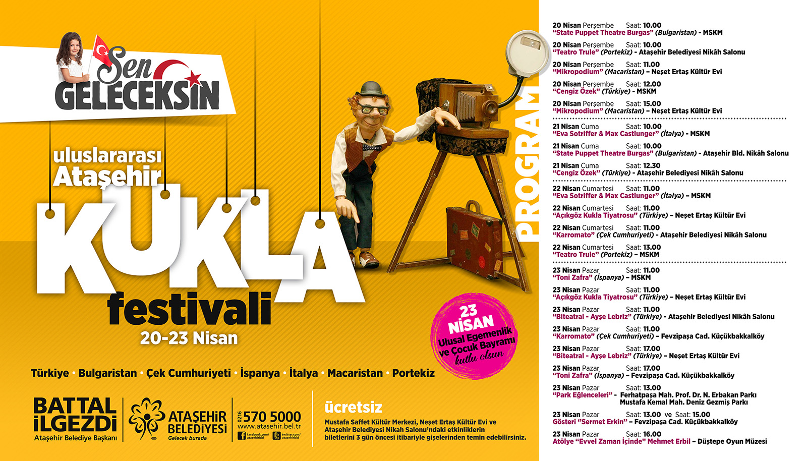 Kukla Festivali’ne Türkiye’den Biteatrel “Masal Gülleri”, Açıkgöz Kukla Tiyatrosu “İbiş’in Konağı”, Cengiz Özek Gölge Tiyatrosu ise “Çöp Canavarı” oyunuyla katılıyor. Uluslararası konuklar ise Portekiz’den Teatro Trule, İtalya’dan Eva Sotriffer ve Max Castlunger, İspanya’dan Toni Zafra, Çek Cumhuriyeti’den Karromato ile Bulgaristan’dan State Puppet Theatre Bourgas. Yediden yetmişe herkese açık Uluslararası 23 Nisan Kukla Festivali, Ataşehirlileri kuklayla insanların büyülü dünyasına davet ediyor.