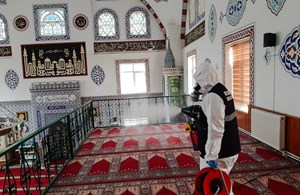 Vatandaşların hijyenik şartlarda ve güven içerisinde ibadetlerini yerine getirebilmeleri için yapılan dezenfeksiyon çalışmalarında; tüm alanlar özel kıyafetli personel tarafından püskürtme yöntemiyle detaylı bir şekilde ilaçlanıyor.