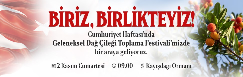Ataşehir Belediyesi, Cumhuriyet Bayramı haftası kapsamında Geleneksel Dağ Çileği Toplama Festivali düzenliyor. "Biriz, Birlikteyiz" sloganıyla yola çıkan Ataşehir Belediyesi, bu yılki etkinliği 2 Kasım günü saat 09.00'da Kayışdağı Ormanı'nda gerçekleştirecek.