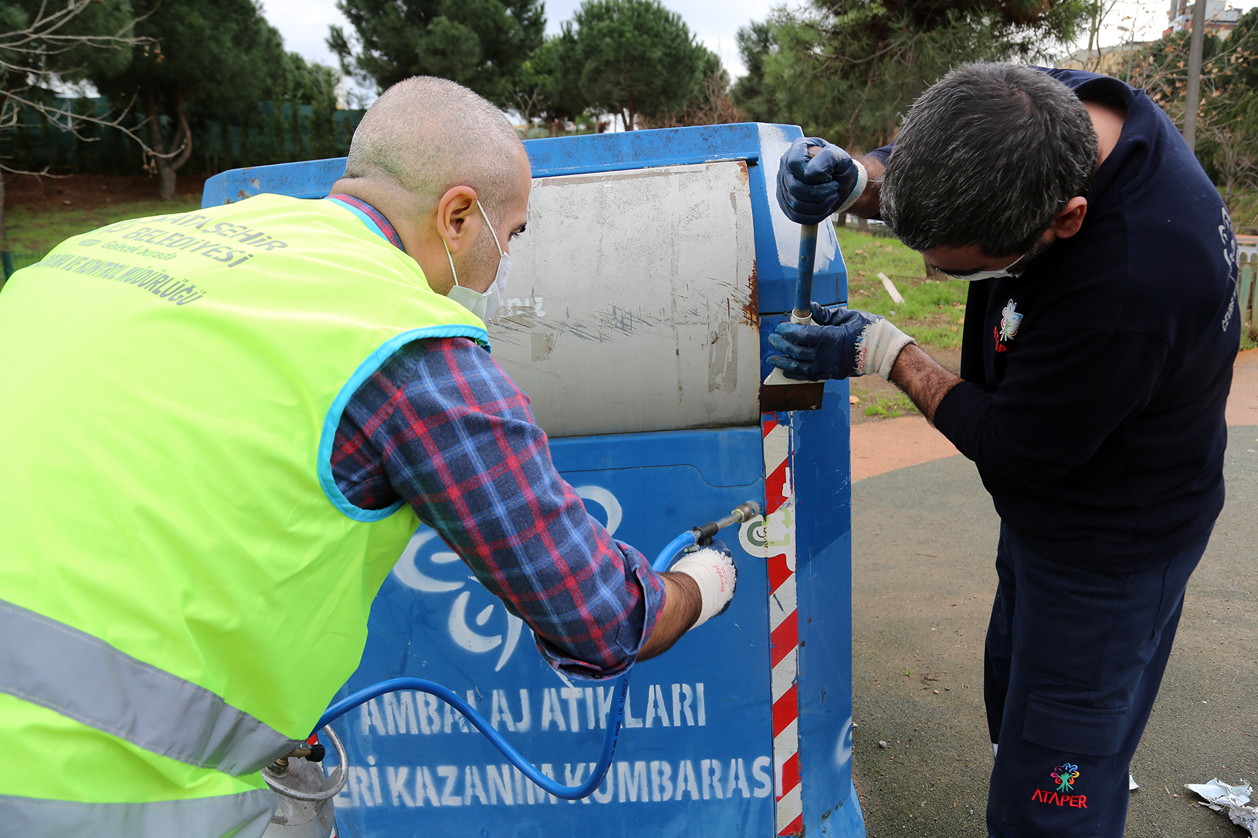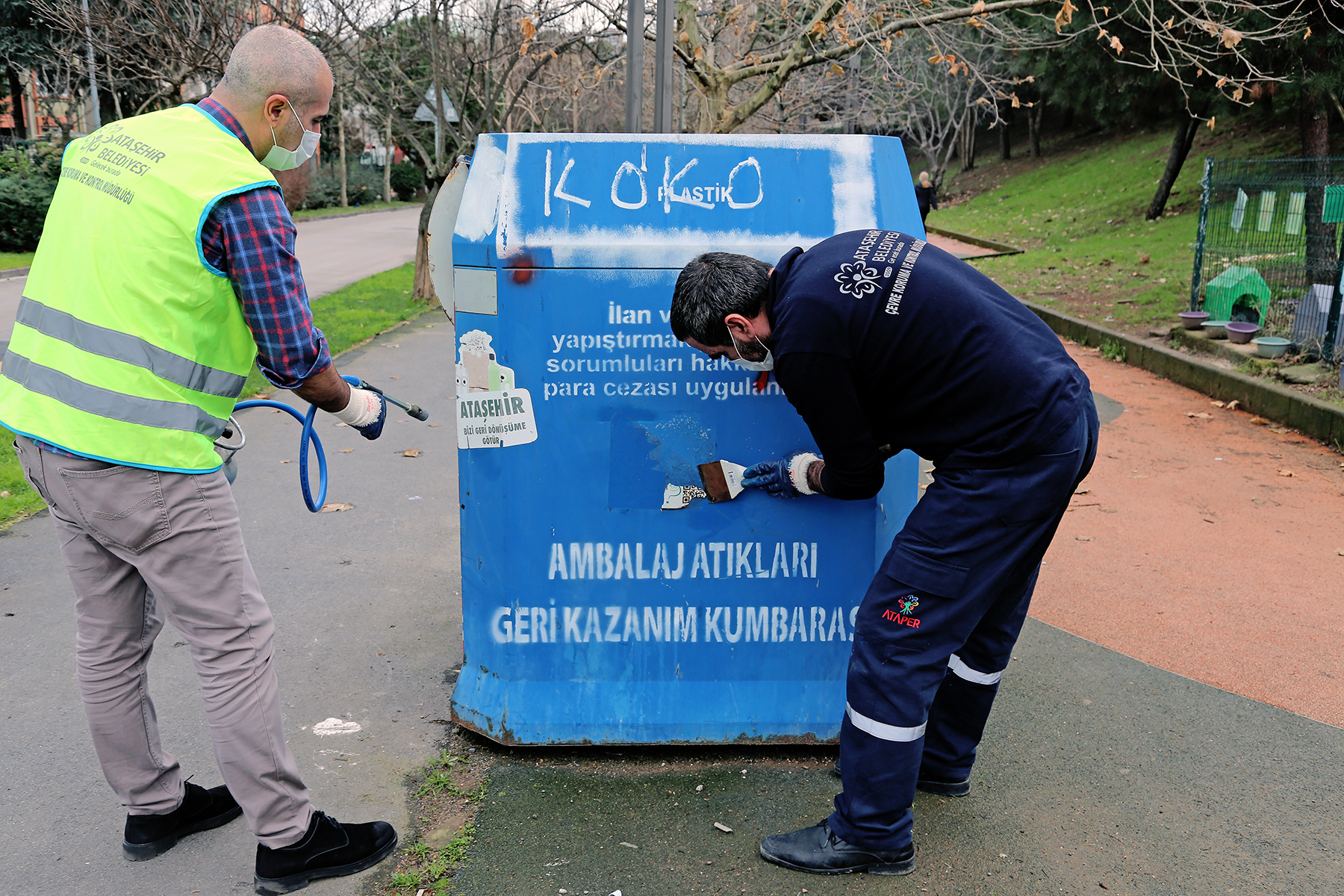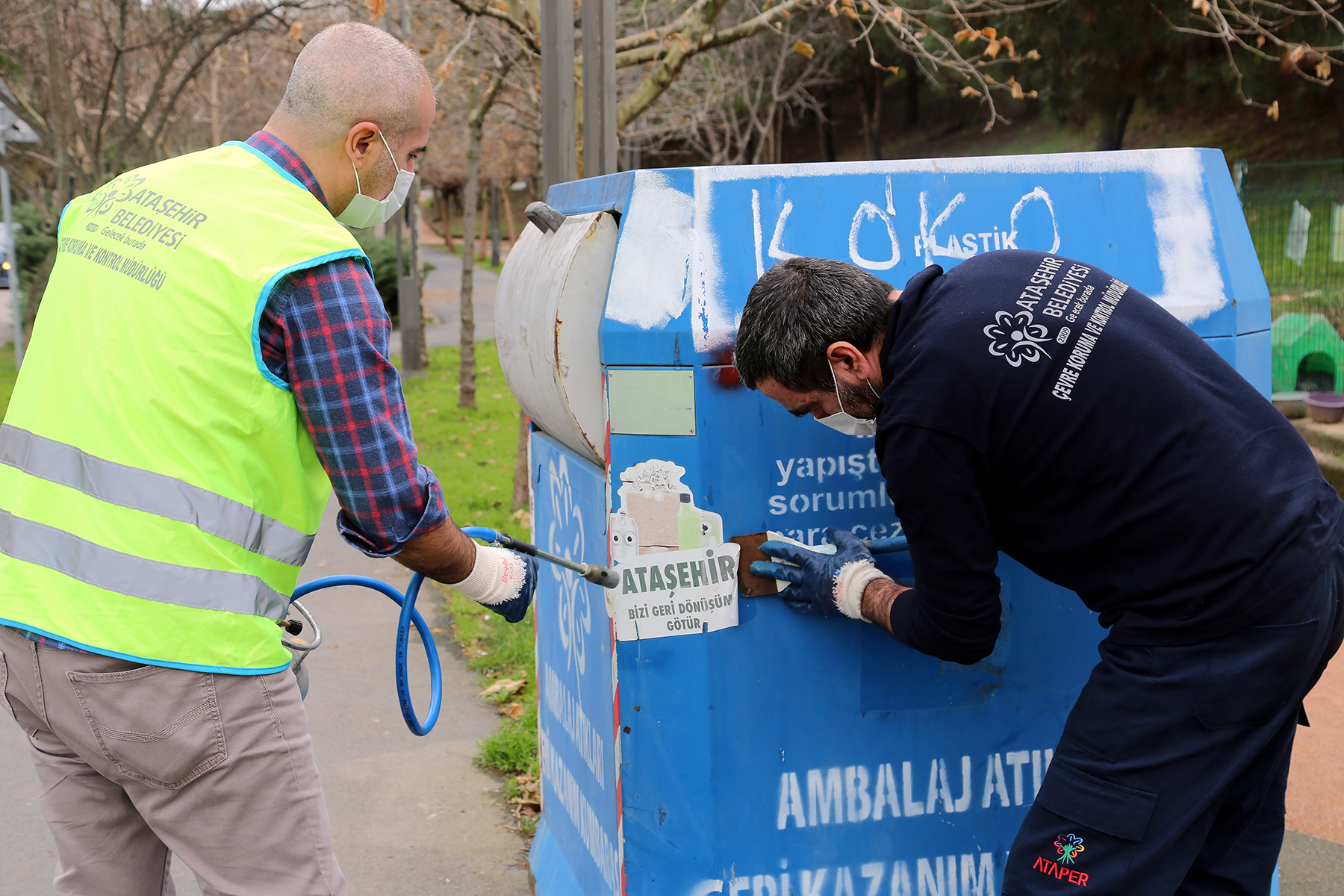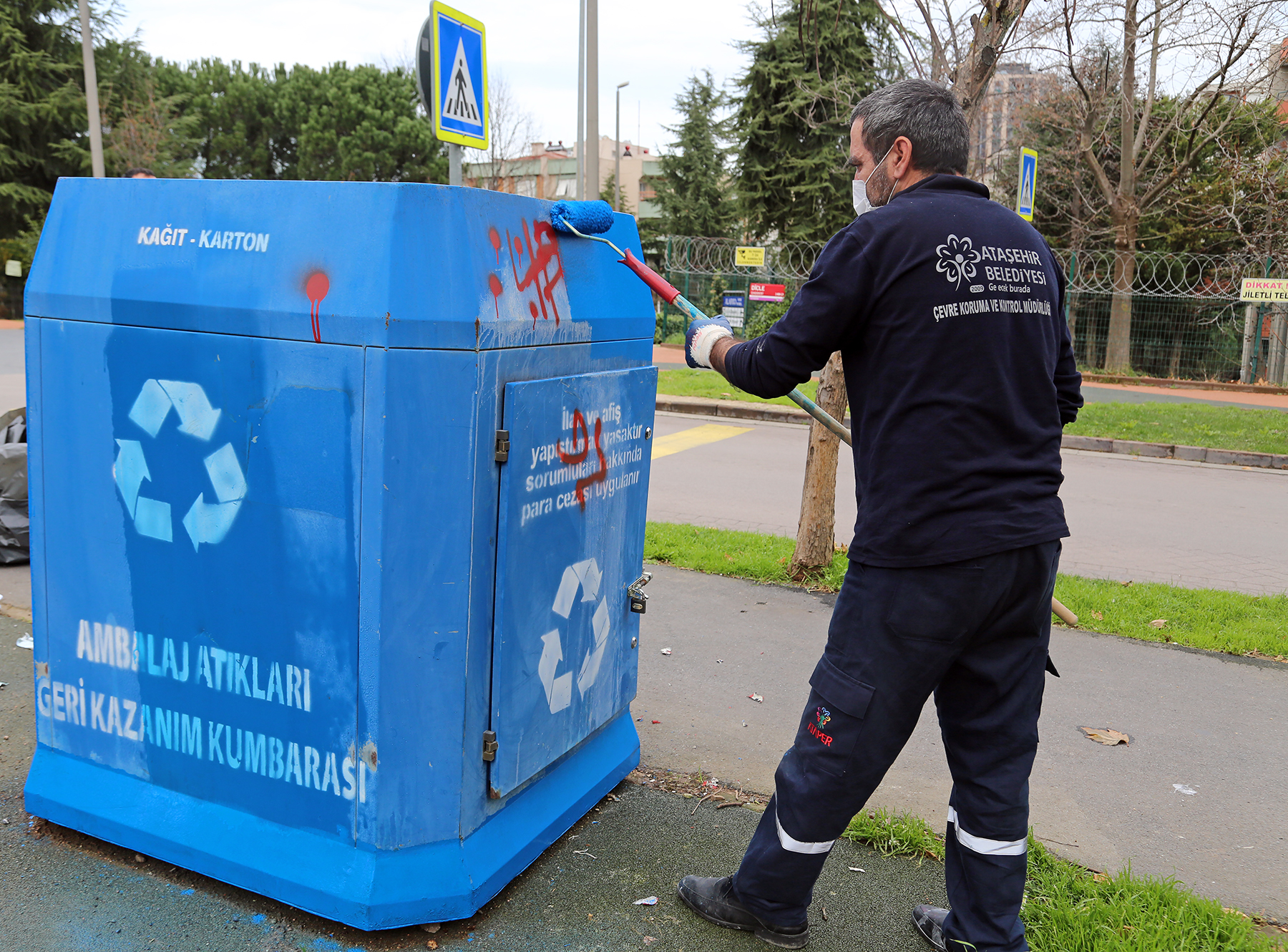 Ataşehir Belediyesi Çevre Koruma ve Kontrol Müdürlüğü ekipleri, sıfır atık ve geri dönüşüm çalışmalarını aralıksız devam ederken, ana caddeler ve belirli noktalardaki geri dönüşüm kutularını da boyayarak yenileme işlemlerini gerçekleştiriyor.