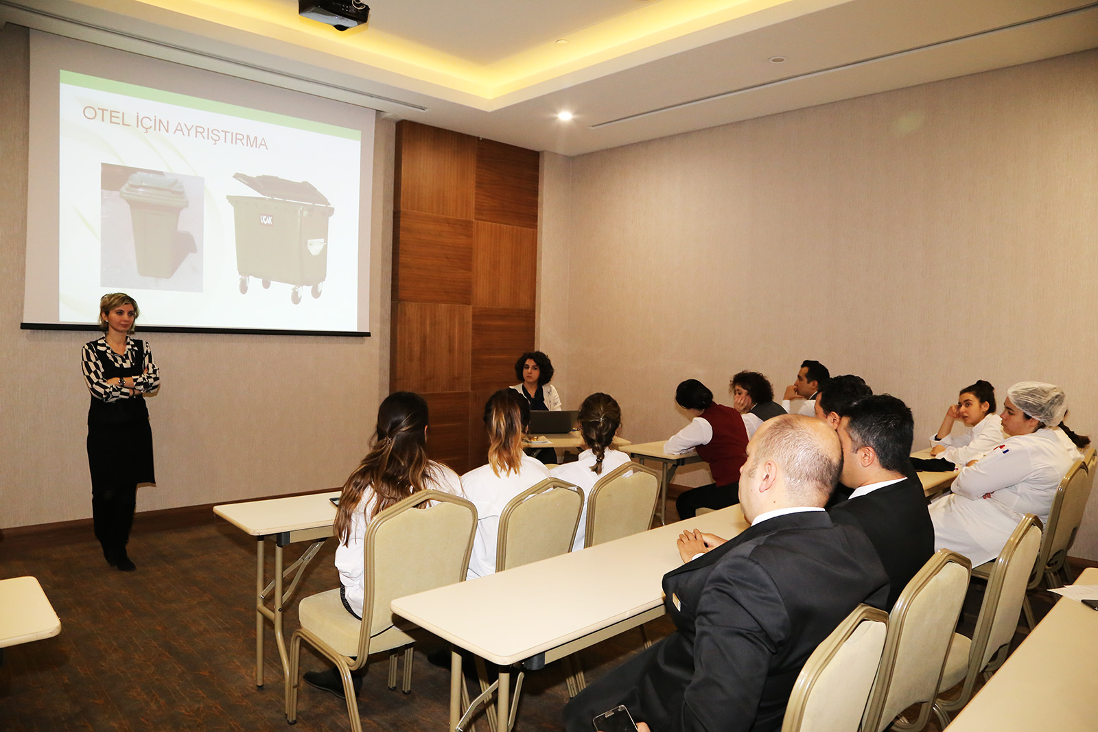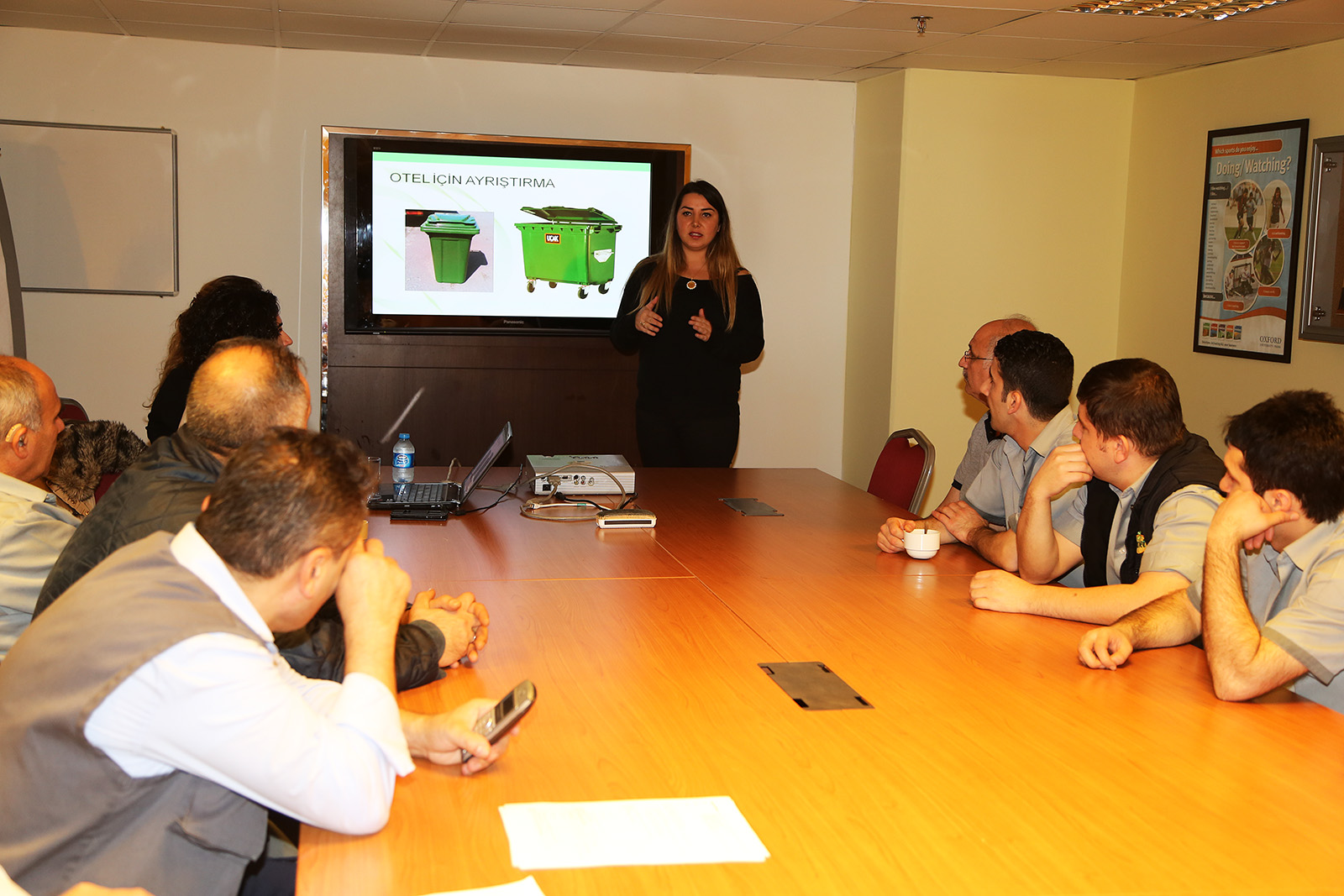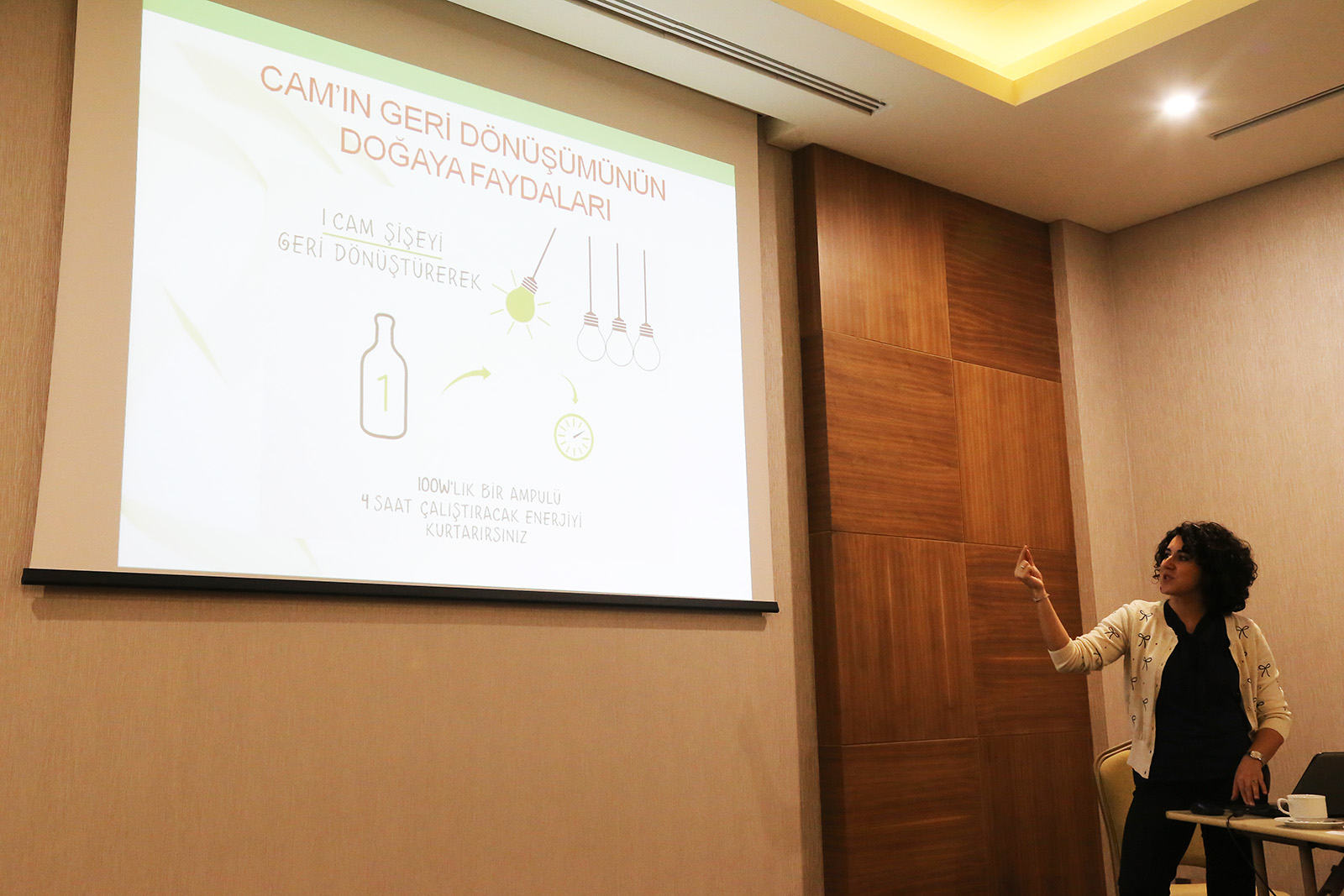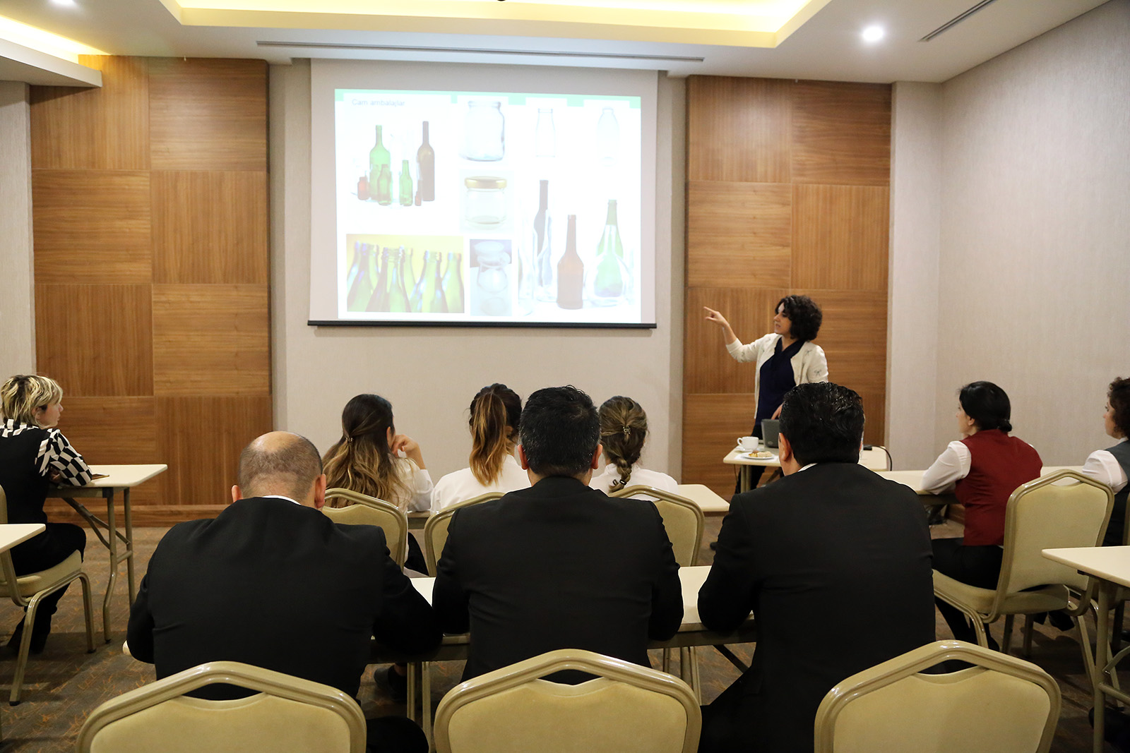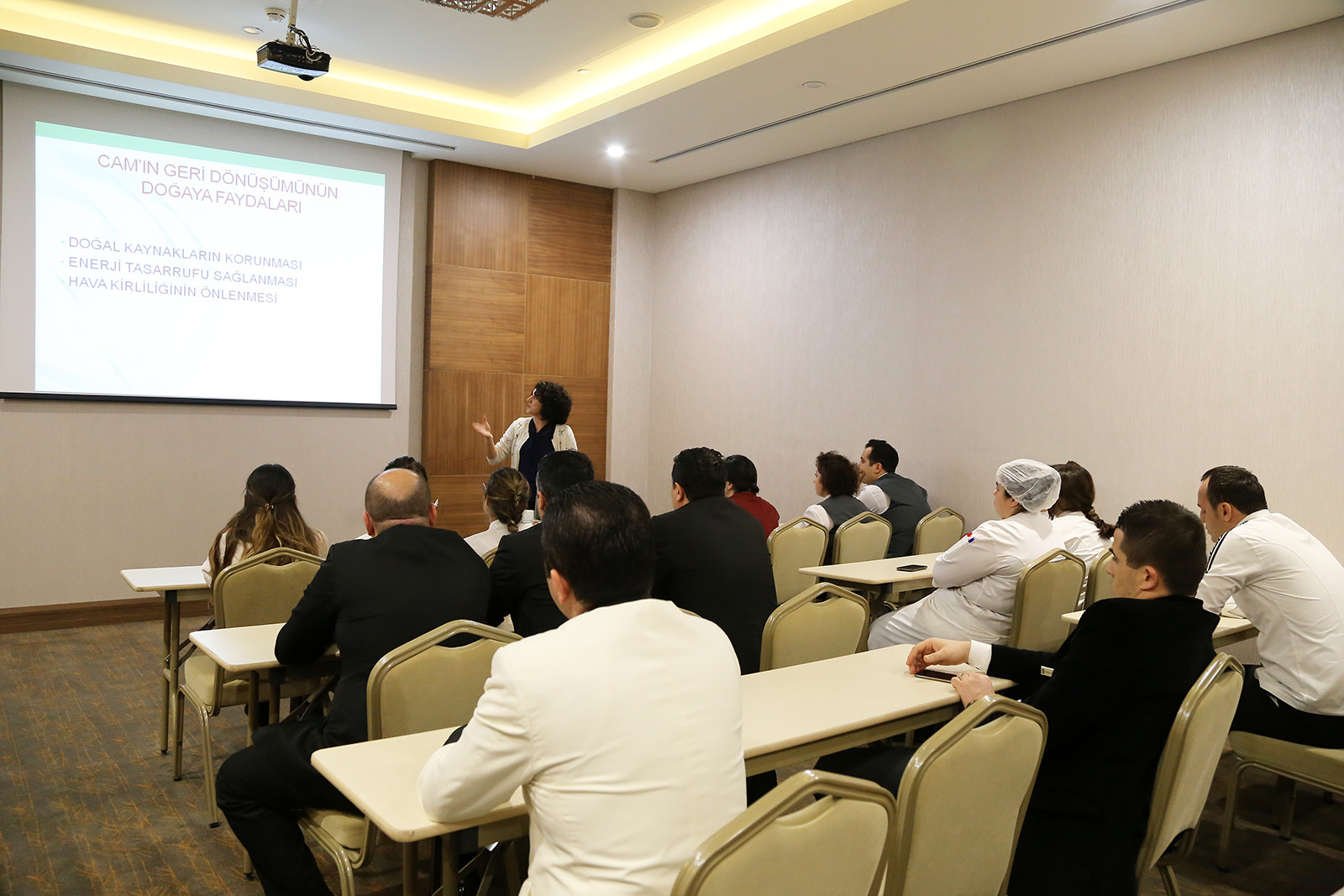 Eğitim kapsamında geri dönüşümün önemi, atık camların kirlenmeden evsel atıklardan ve diğer ambalaj atıklarından ayrı olarak toplanması, otellerde daha verimli ve sürdürülebilir toplama sisteminin kurulması konularında bilgiler veriliyor.