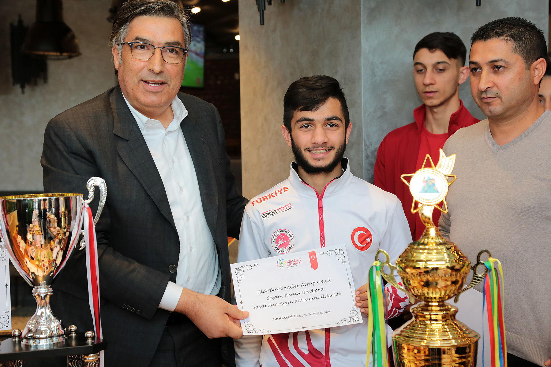 Kick Boks sporunda bu yıl Türkiye’yi ve Ataşehir’i temsil ederek derece kazanan Dünya Şampiyonu Emine Arslan, Dünya İkincisi Kadir Altay ve Gençler Avrupa Üçüncüsü Yunus Baybora Ataşehir Belediyesi tarafından hediye çeki ile ödüllendirildi.