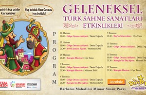 Geleneksel Türk Sahne Sanatları etkinlikleri kapsamında; 26-27-28 Haziran, 03-04-05 Temmuz ve 10-11-12 Temmuz tarihlerinde Gölge Oyunu Atölyesi, Karagöz ve Hacivat gösterileri ile İbiş’in Maceraları isimli oyunlar sahnelenecek.