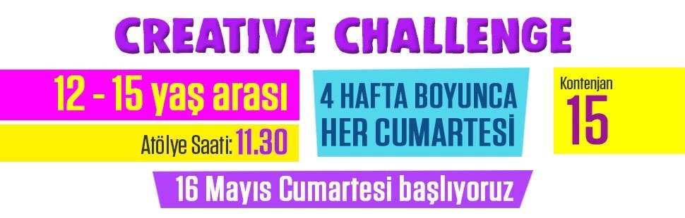 12-15 yaş arası gençlerin eğlenirken düşünecekleri, düşünürken tasarlama fırsatı yakalayacakları online “Creative Challenge” atölyesi 4 hafta sürecek ve Zehra Karadağ yönetiminde, zoom programı üzerinden gerçekleştirilecek.