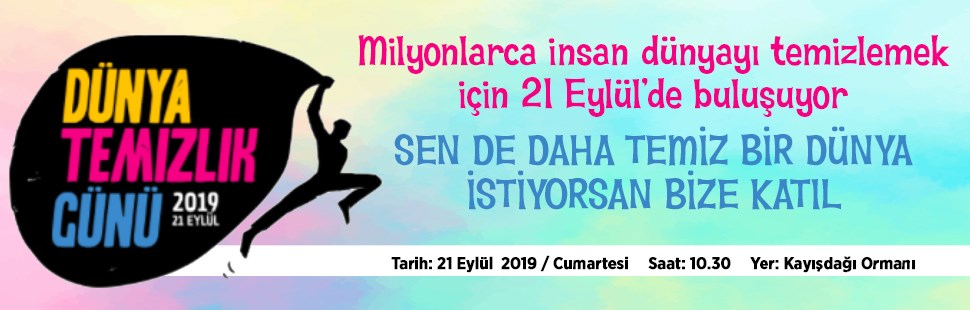 Daha temiz bir gelecek için tüm çevre dostları olarak; 21 Eylül 2019 Dünya Temizlik Günü’nde saat 10.30’da Kayışdağı Ormanı- Ferhatpaşa Mahallesi Ferhatpaşa Yolu Caddesi ile 29. Sokak kesişiminde buluşuyoruz.