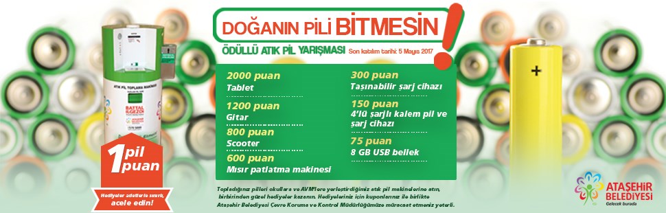 Yoğun talep dolayısıyla yarışmamızda kupon yerine pil de kabul ediyoruz. Topladığınız atık pilleri Çevre Koruma ve Kontrol Müdürlüğü’ne getirip hediyenizi teslim alabilirsiniz.