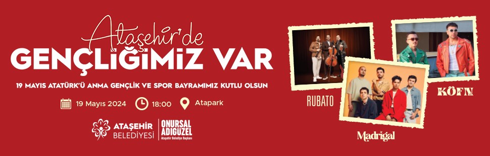 Ataşehir Belediyesi 19 Mayıs Atatürk’ü Anma, Gençlik ve Spor Bayramı’nın 105’inci yıl dönümünü; coşku dolu konserler, spor etkinlikleri ve Tarihçi - Yazar İlber Ortaylı’nın söyleşisiyle kutlayacak. Gençler için özel olarak hazırlanan program kapsamında müzikseverlerin ilgiyle takip ettiği sevilen gruplar Rubato, Köfn ve Madrigal Ataşehir’de sahne alacak.
