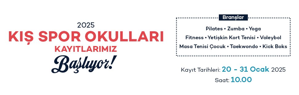 2025 Kış Spor Eğitimleri 1. dönem derslerine kayıtlar, internet üzerinden online olarak yapılacak ve 20 - 31 Ocak 2025 tarihleri arasında gerçekleştirilecek. 3 Şubat’ta başlayacak spor eğitimleri, 2 Haziran’a kadar devam edecek.