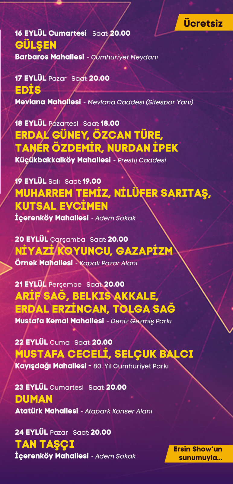 Tüm konserlerin ücretsiz olacağı festival boyunca sırasıyla; Gülşen, Edis, Erdal Güney, Özcan Türe, Taner Özdemir, Nurdan İpek, Muharrem Temiz, Nilüfer Sarıtaş, Kutsal Evcimen, Niyazi Koyuncu, Gazapizm, Arif Sağ, Belkıs Akkale, Erdal Erzincan, Tolga Sağ, Mustafa Ceceli, Selçuk Balcı, Duman ve Tan Taşçı olmak üzere müziğin farklı dallarından usta isimler müzikseverle buluşacak.