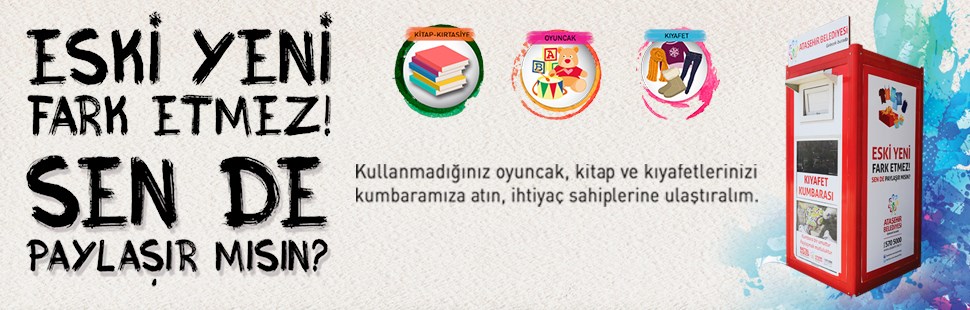 Kitap, kıyafet, oyuncak bağışlarınızı, Ataşehir sınırları içerisinde bulunan kumbaralarımıza bırakabilirsiniz.
