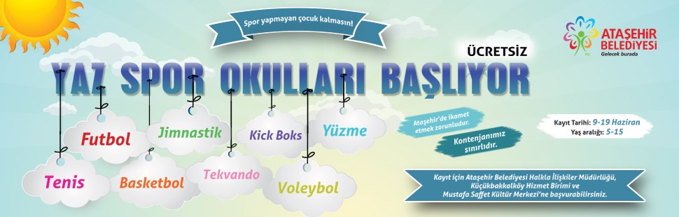 09-19 Haziran tarihleri arasında Basketbol, Voleybol, Futbol, Tekvando, Kick Boks, Jimnastik, Yüzme, Tenis dallarında ücretsiz Yaz Spor Okullarına kayıt yaptırmak isteyen Ataşehirli aileler, Ataşehir Belediyesi Halkla İlişkiler Müdürlüğü, Küçükbakkalköy Hizmet Birimi ve Mustafa Saffet Kültür Merkezi’ne müracaat ederek çocuklarının kaydını yaptırabilirler.