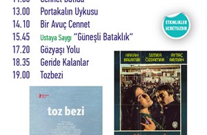 Festival kapsamında 4 Ekim’de İçerenköy Cemevi Etkinlik Salonu’nda; “Cennet Batıda”, “Portakalın Uykusu”, “Bir Avuç Cennet”, “Güneşli Bataklık”, “Gözyaşı Yolu”, “Geride Kalanlar” ve “Tozbezi” isimli filmler izleyiciyle buluşacak.