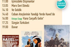3 Ekim’de Ataşehir Mustafa Saffet Kültür Merkezi’nde; “İçimizdeki Düşmanlar”, “Marx Geri Döndü”, “Ve Geldik”, “Çoban Ateşlerinin Yandığı Yerde Kavel’de” , “Kara Çarşaflı Gelin”, “Sürgün Türküleri” ve “Duvar” isimli filmler gösterilecek. Aynı gün İçerenköy Arguvan Merkez Derneği’nde “Gelin” ve “Otobüs Yolcuları” isimli filmler gösterilecek.