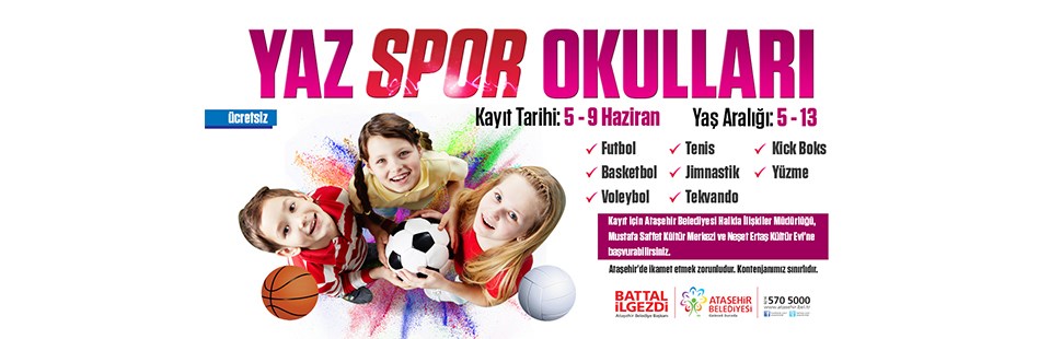 5-13 yaş arasında çocukların katılacağı Yaz Spor Okullarına kayıtlar Ataşehir Belediyesi Halkla İlişkiler Müdürlüğü, Mustafa Saffet Kültür Merkezi ve Neşet Ertaş Kültür Evi’nde yapılacak.